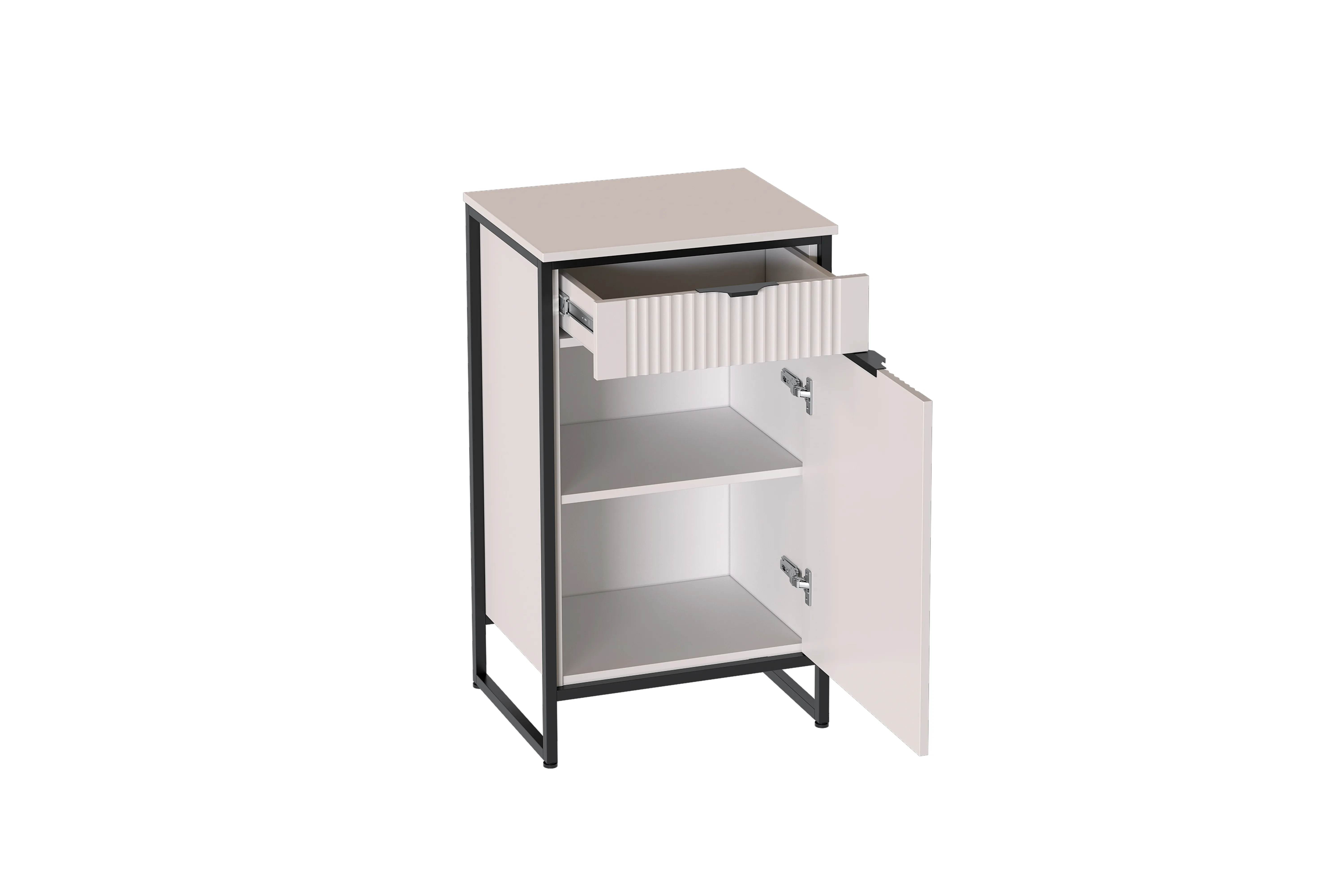 В верхней части тумбы "Нора" установлен выдвижной ящик на шариковых направляющих с доводчиками. Нижняя часть тумбы закрыта распашной дверью, за которой установлена съемная полка. Дверь может устанавливаться как на правую, так и на левую сторону и оснащена петлями с доводчиками.