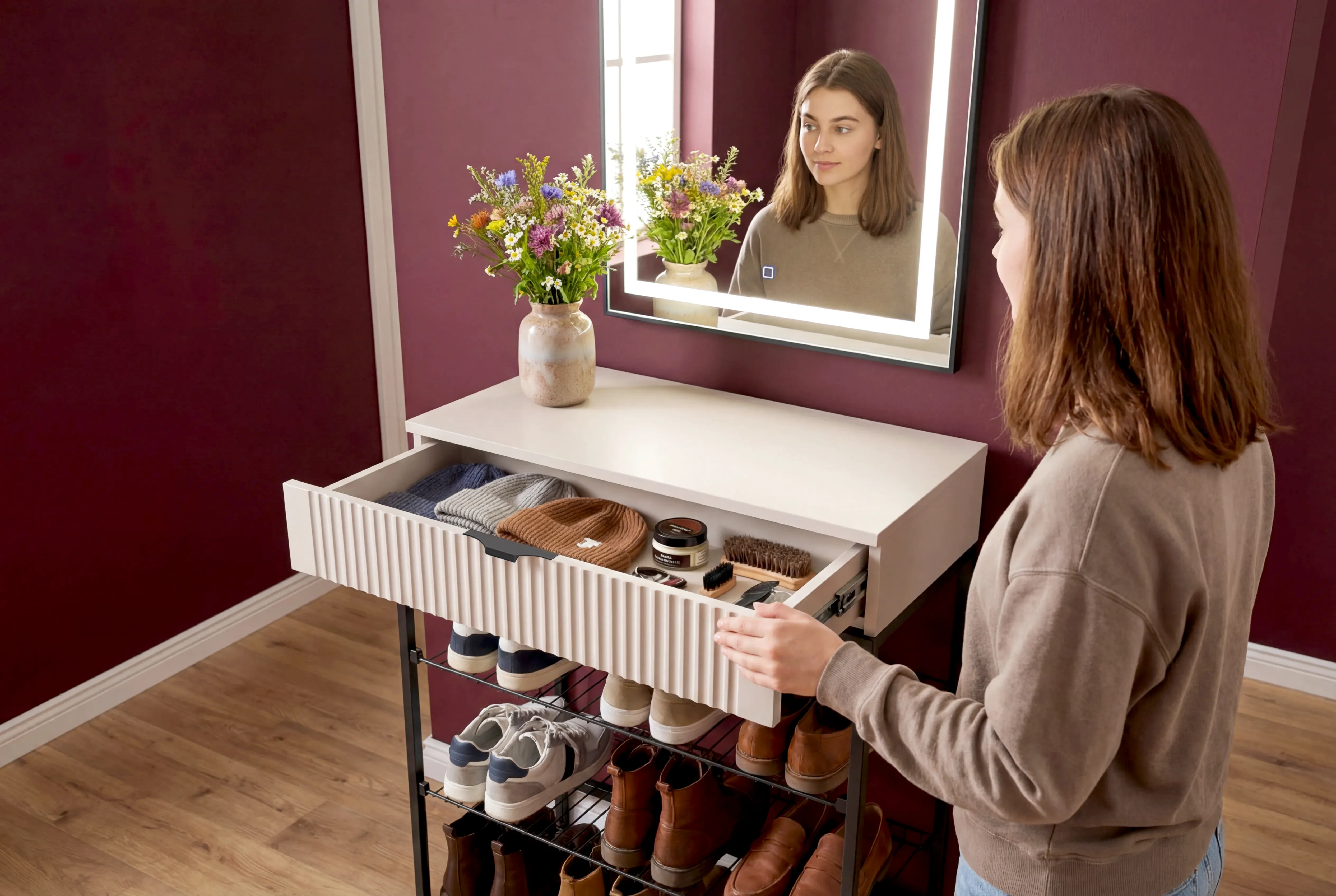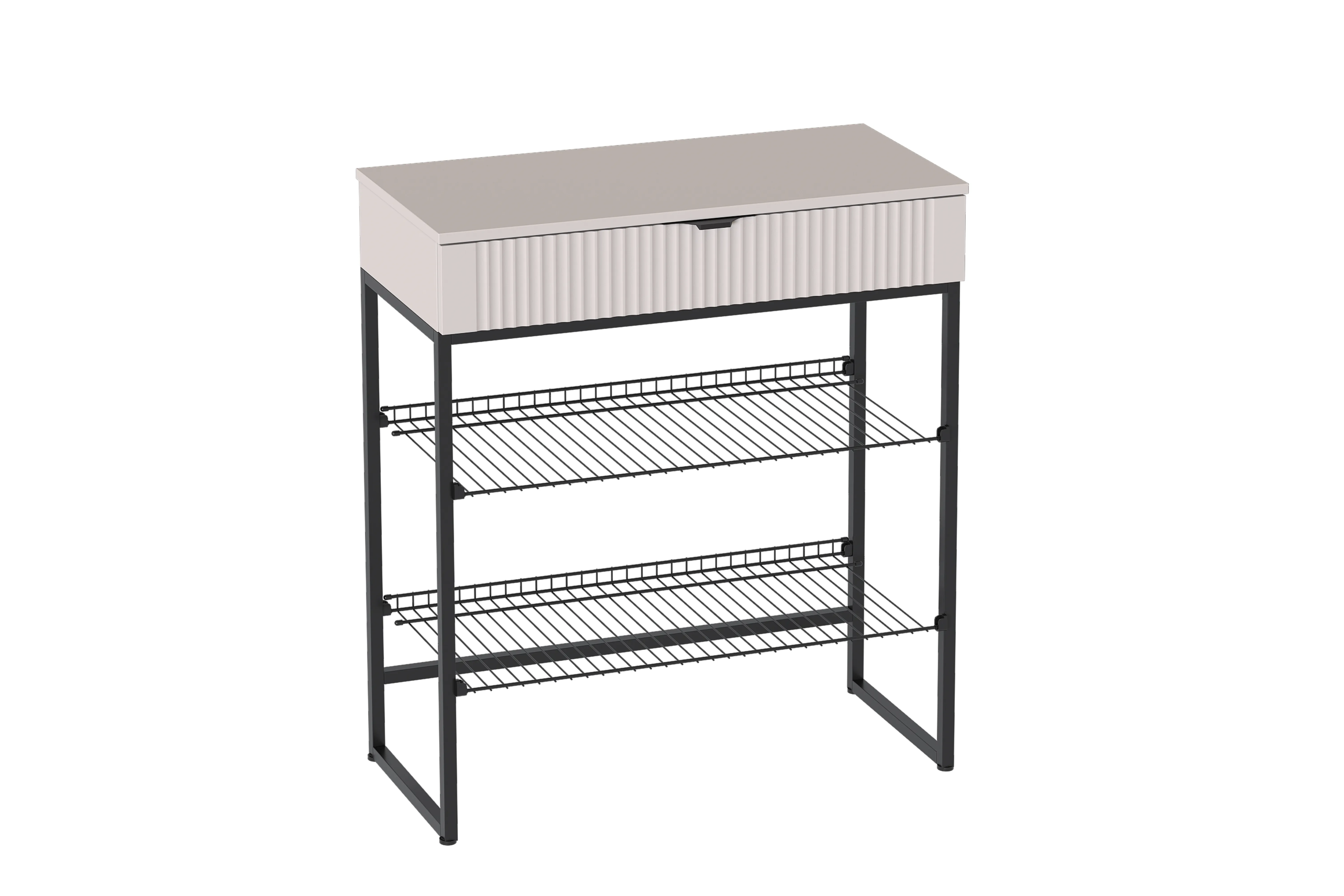 Тумба для обуви "Нора" состоит из несущего металлического каркаса и закрепленного к нему корпуса из ЛДСП , внутри которого установлен выдвижной ящик на шариковых направляющих с доводчиками. Между боковыми металлическими рамами закрепляются стальные сетки для хранения обуви.